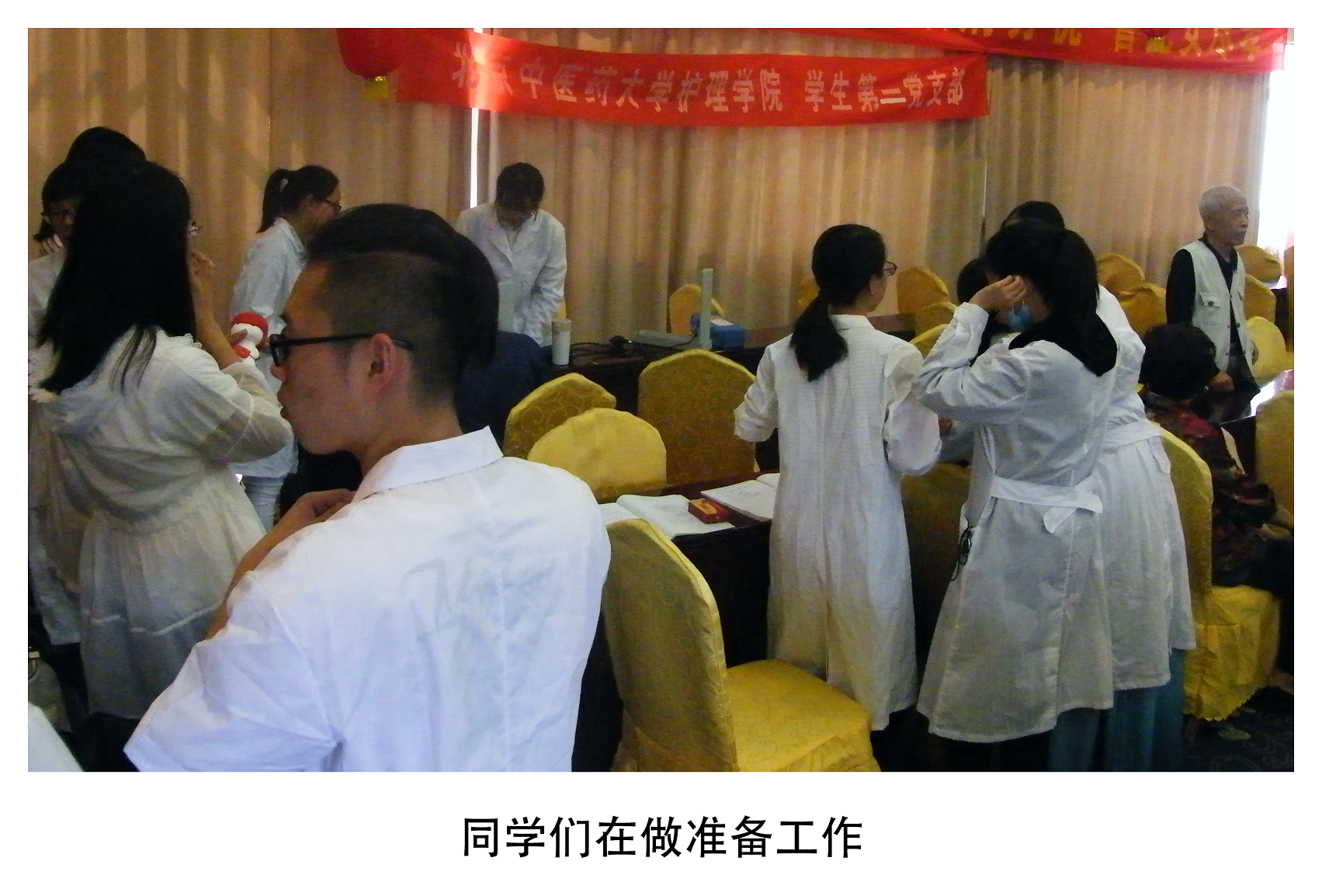 不到十分钟的时间,同学们已经换好了白大褂、打开了血压计、拿出了耳豆板、挂好了横幅。