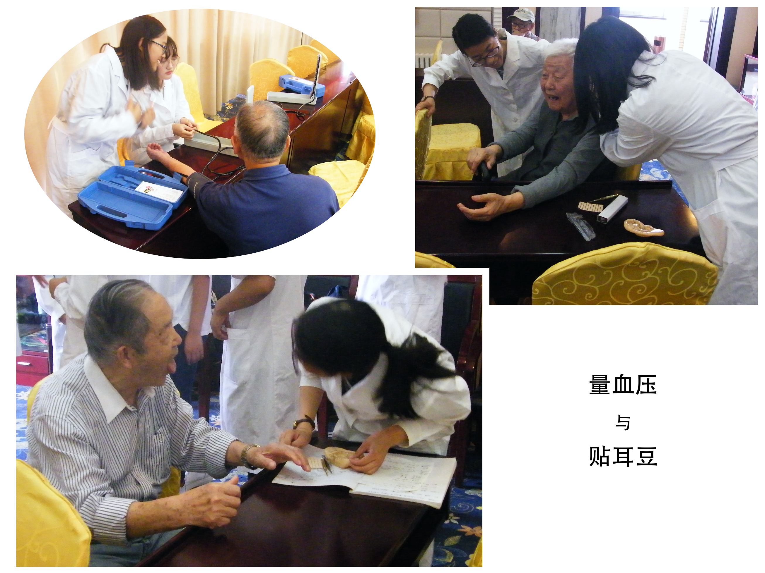 量血压的同学在忙活手里操作的同时,要问一问老人们日常的状态如何,比如睡眠情况、食欲如何、平时情绪如何等等。贴耳豆的同学要反复跟老人们解释“中医的脏腑跟西医的器官是有区别的,耳朵的不同部位对应不同的脏腑。我们给您贴耳豆,学名叫耳针,其实就是按摩刺激穴位,改善脏腑的情况。”