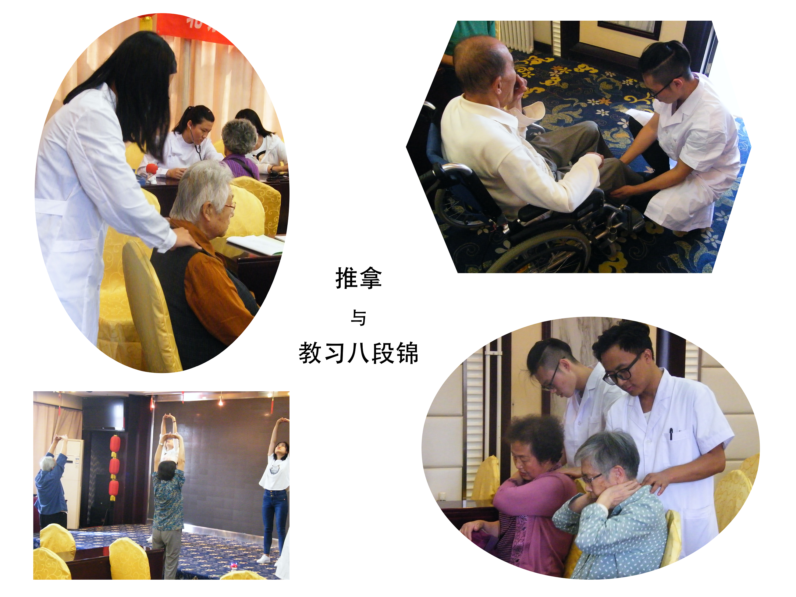 正说着,几位同学拿出手机,放起音乐,带着几位老人做起八段锦了。听李经理说,这个养生庄园挺重视中医养生,平时也教老人们太极拳、八段锦、五禽戏等等健身操,有的老人本身也会练。难怪,老人们一招一式都很像样,跟着学生们一起做,手眼身法步,仿佛年轻了许多。