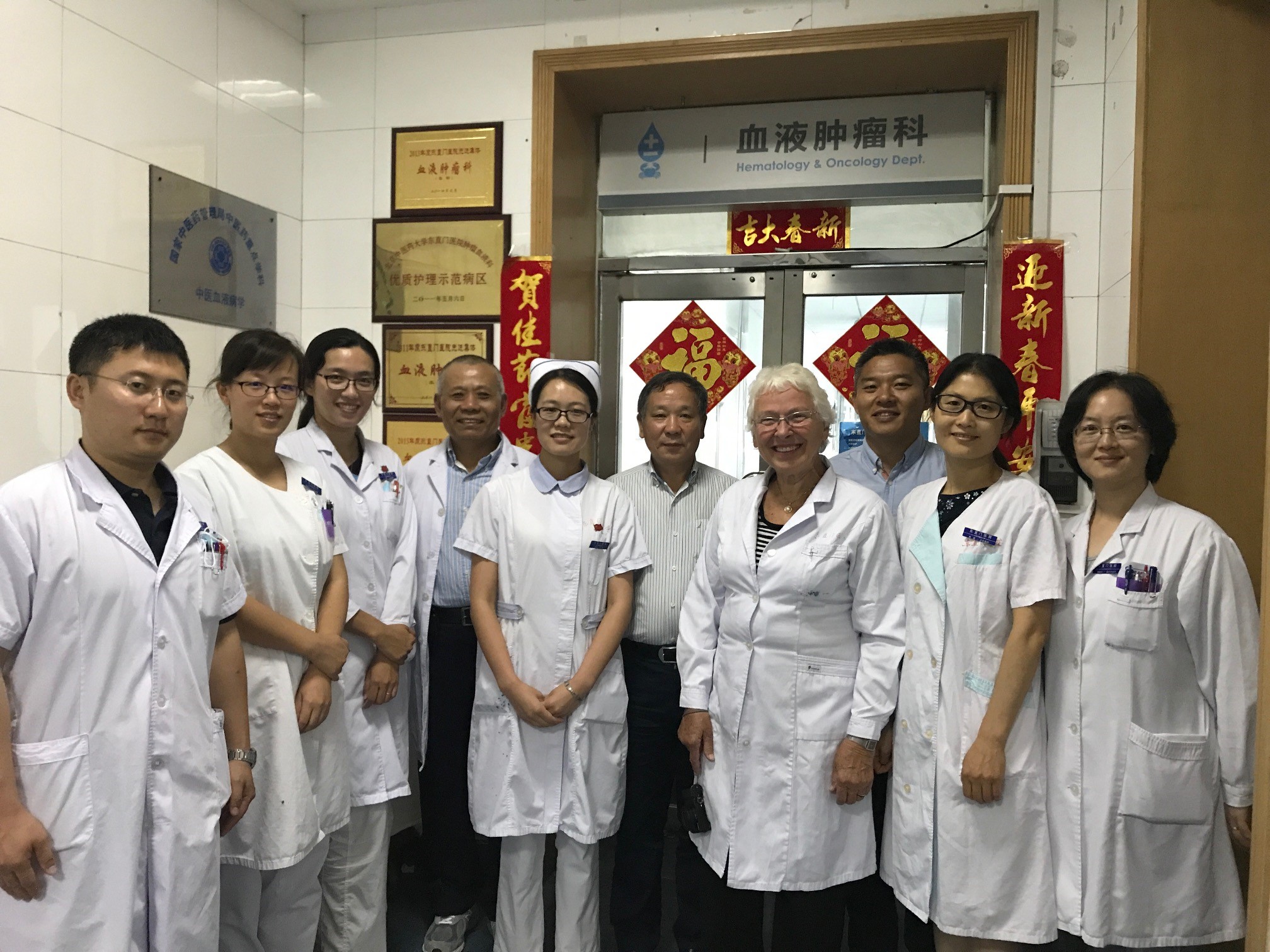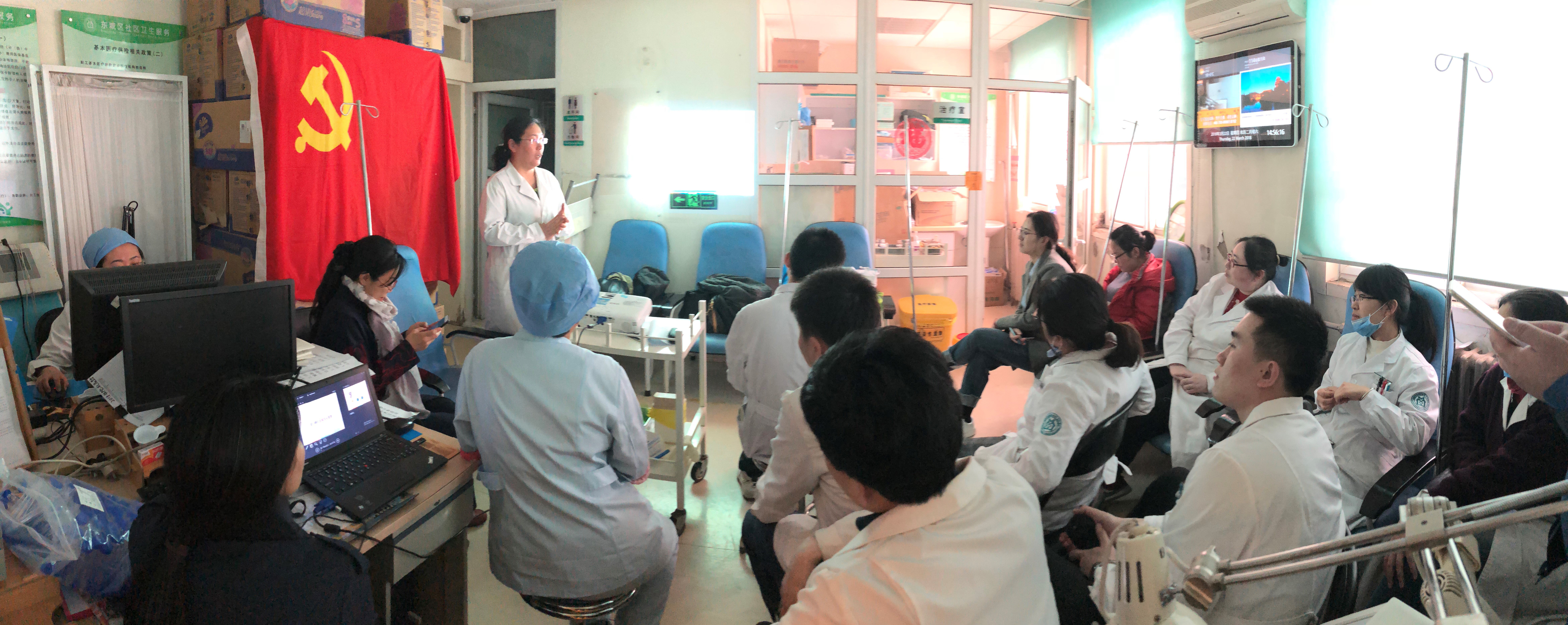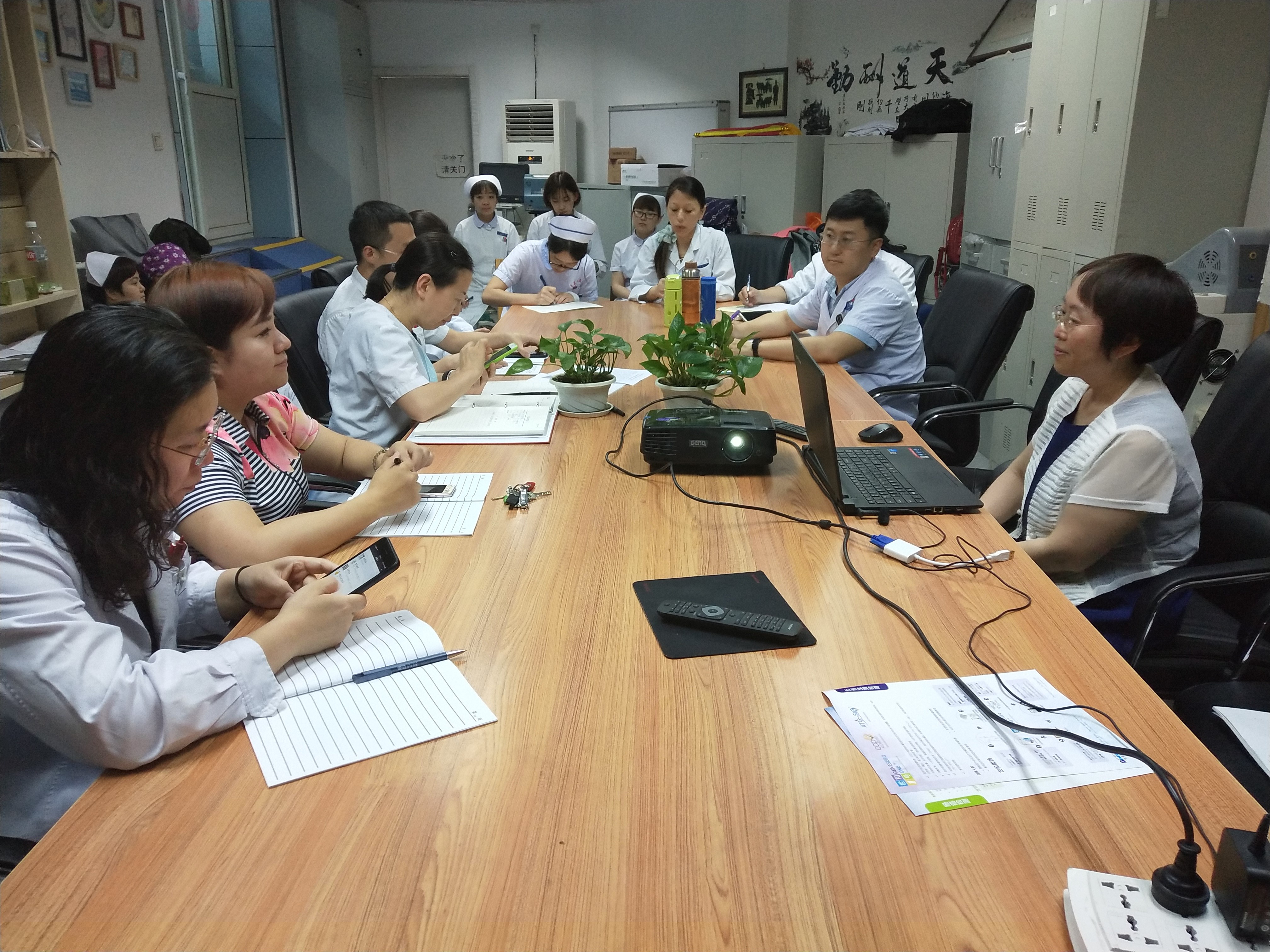 2018年4月的一个清晨,在血液肿瘤科医生办公室,身形清瘦的侯丽书记正微笑地和几位医护人员亲切地交谈,了解科室医护人员的近况和想法,鼓励大家认真学习党的十九大报告,领会精神,促进行动,以文化引领工作。“努力学习和顽强拼搏,将来不会后悔,”她说,“我们收获的将不仅是知识的丰富、工作的顺利、精神的富足,更有带给患者以及其家人的幸福!”