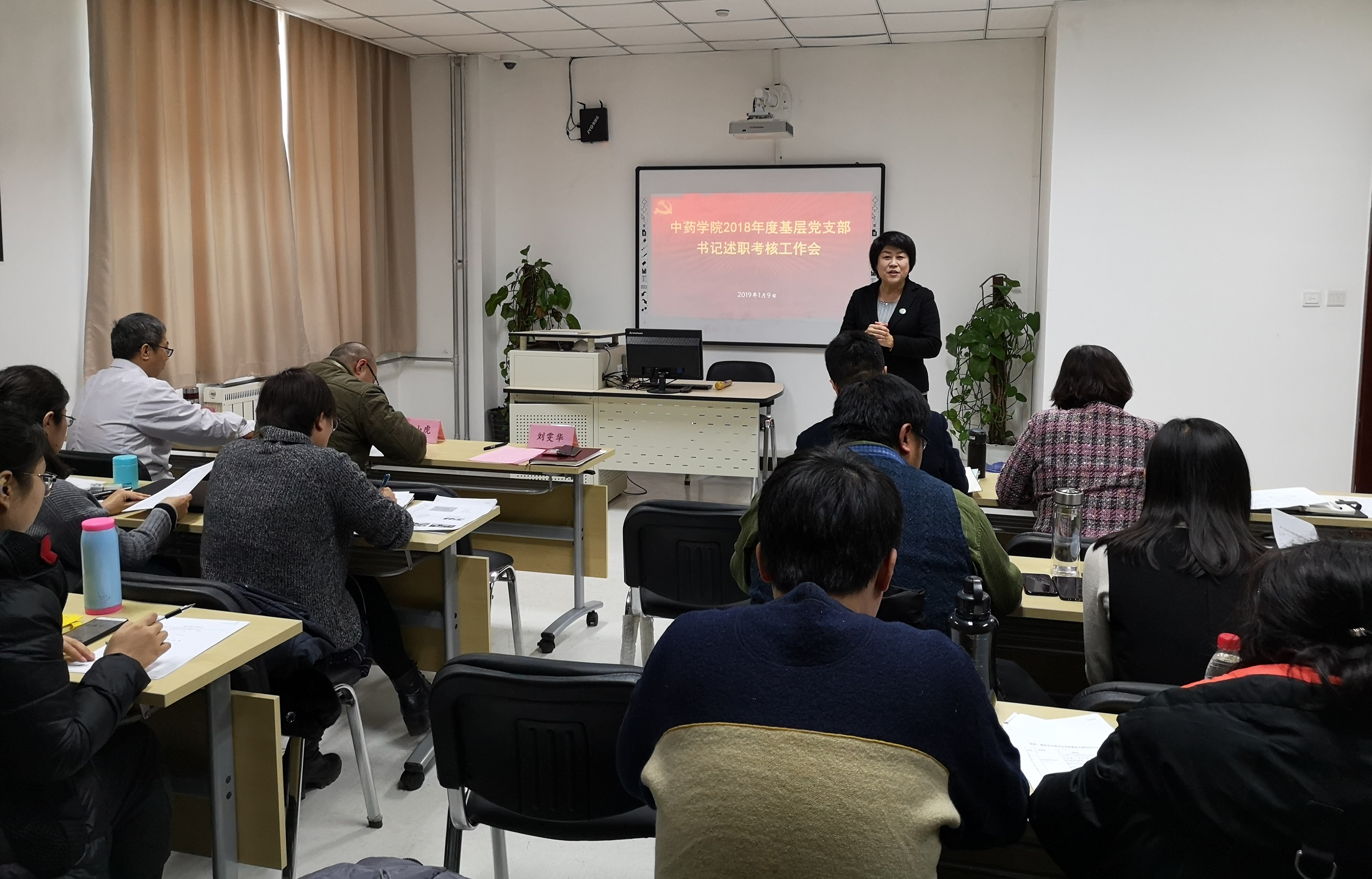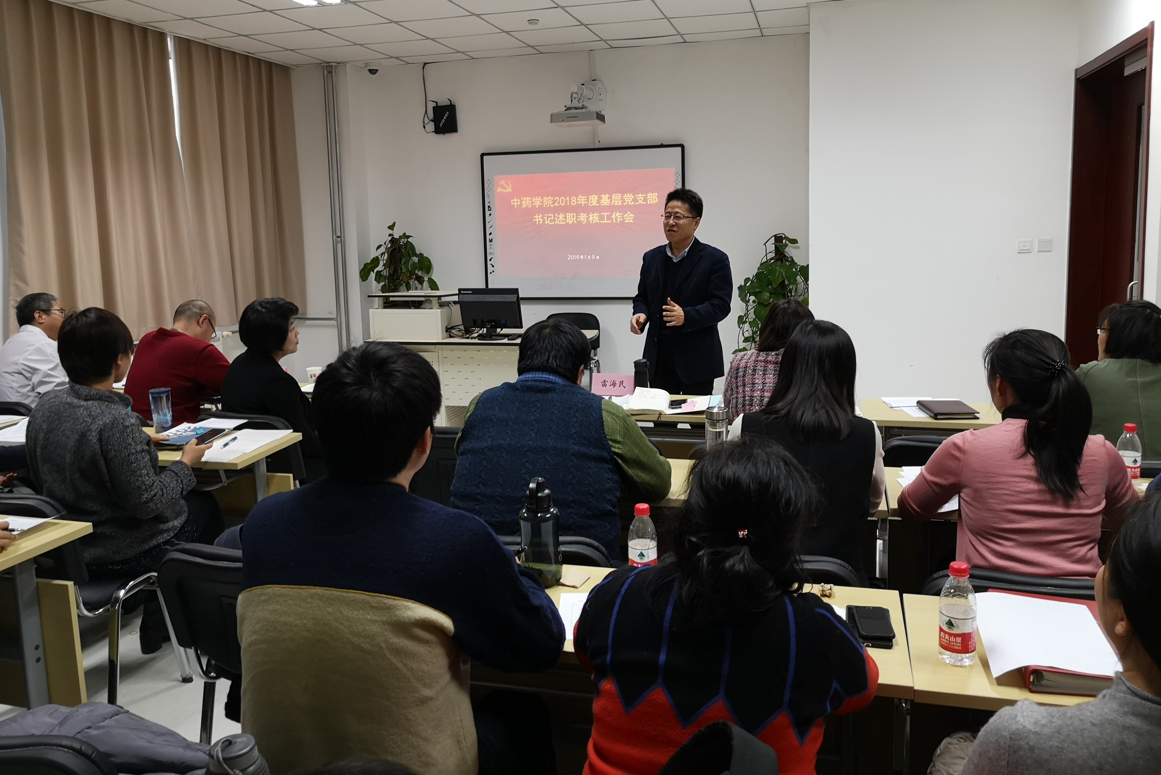 刚刚过去的2018年,中药学院落定新家不久,就迎来了中药学专业认证、本科教学工作审核评估、中药学学位授权点自评估。经过全院师生的凝聚力量和不懈奋斗,顺利通过各项认证和评估,以优异的成绩献礼中药高等教育60周年和中药学院成立60周年。2018年是学院发展史上的里程碑,值得在回顾中总结凝练提升。作为回顾总结凝练提升的重要组成部分,中药学院党支部书记述职考核大会于2019年1月9日召开。中药学院院长雷海民、党委副书记艾路、党外知识分子代表孙毅坤教授、21名党支部书记、群众代表、学生代表及党务秘书济济一堂,共同总结考评2018年学院党建工作,梳理问题,查摆原因,展望开启更好的未来。会议由党委书记刘雯华主持。