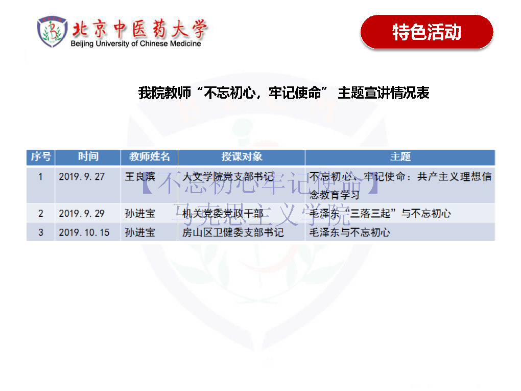 编者按:第二批“不忘初心、牢记使命”主题教育开展以来,我校各二级党组织坚持以习近平新时代中国特色社会主义思想滋养初心、引领使命,原原本本学习,结合实际学习,发挥优势学习,推动学习贯彻习近平新时代中国特色社会主义思想往深里走、往心里走、往实里走;突出分类指导,实现全员覆盖,加强统筹联动,提升整体质量,确保主题教育高标准高质量推进。各二级党组织以自我革命精神检视剖析问题,扎扎实实抓好整改落实,围绕加强党建找问题,聚焦党性修养挖根源,围绕办学育人中的重大问题抓整改,全面提高人才培养能力,加快改革发展步伐,在落实立德树人根本任务、服务经济社会发展、推进“双一流”建设上实现新突破。在此,我们将各二级学院开展主题教育的阶段工作报告分期刊出,供大家相互交流。