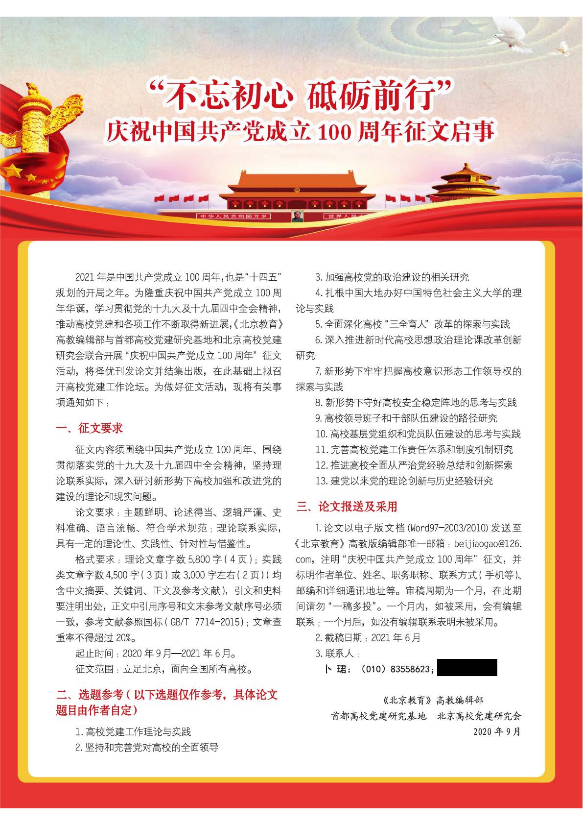 近日,《北京教育》高教编辑部、首都高校党建研究基地、北京高校党建研究会联合发布“不忘初心 砥砺前行 庆祝中国共产党成立100周年征文启事”,现原文转发。有意者可直接向启事内的联络方式洽询有关事宜。
