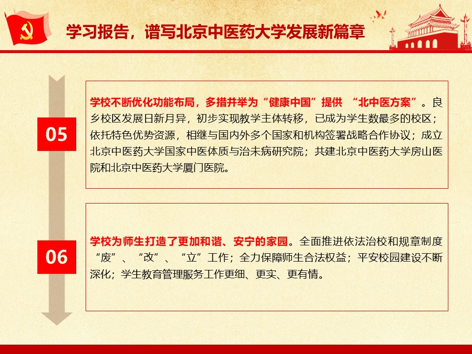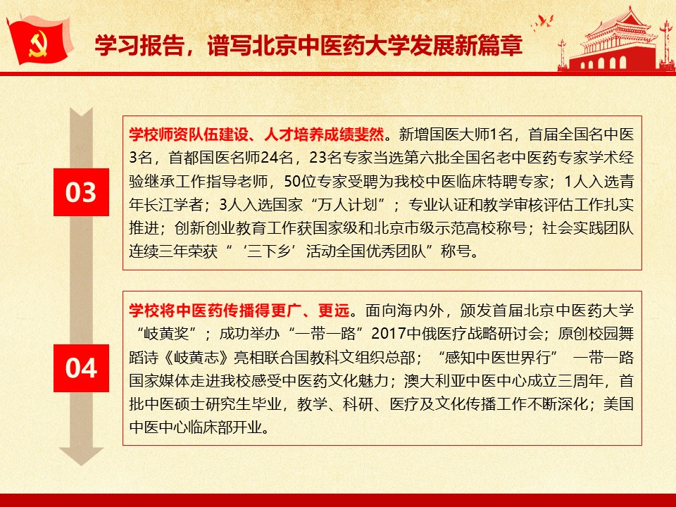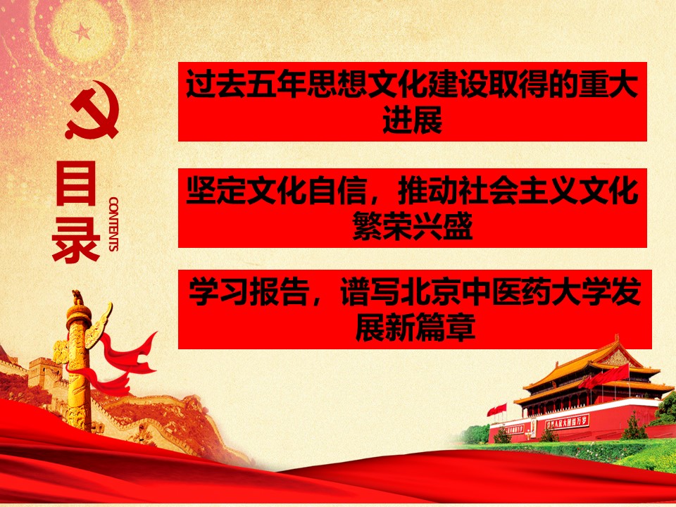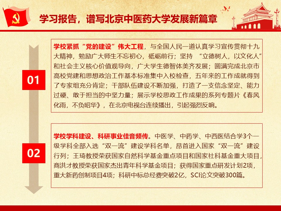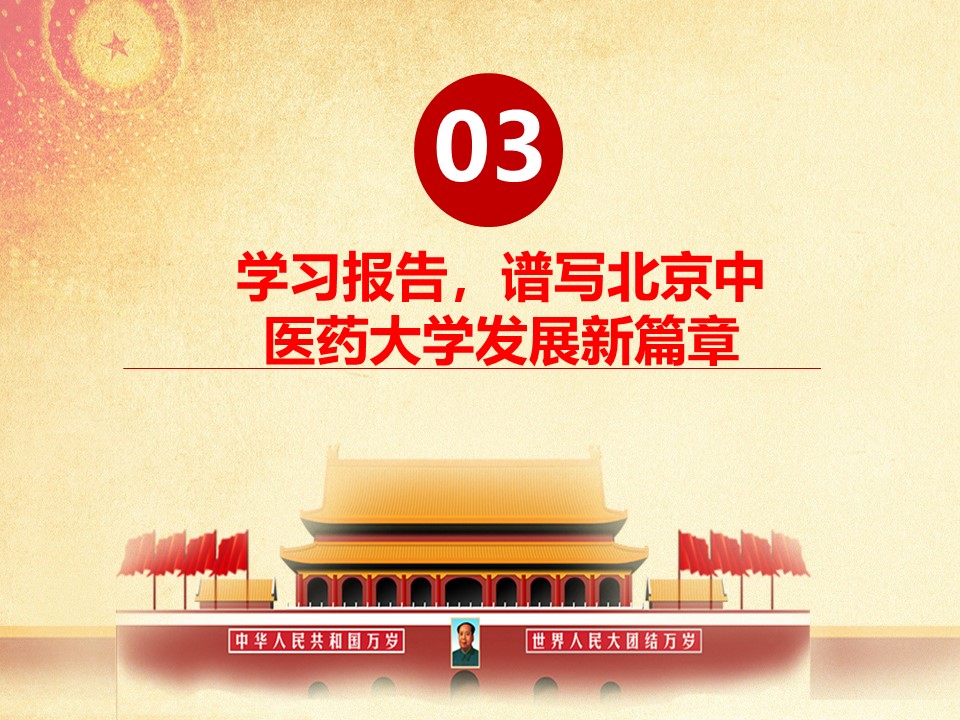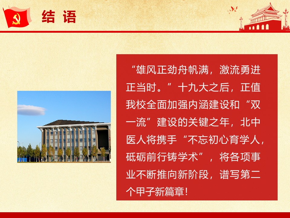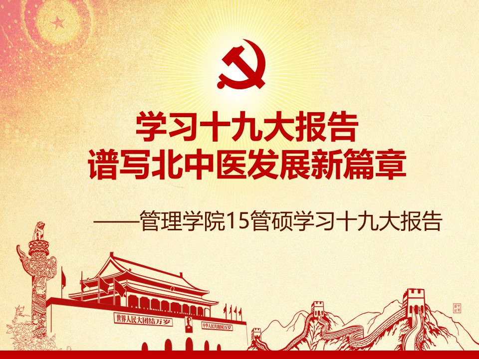党的十九大胜利闭幕后,2026世界杯官方合作网站各级党组织掀起了学习宣传贯彻党的十九大精神的热潮。学校党委组织部、党委宣传部和共青团组织共同举办了“认真学习宣传贯彻党的十九大精神,写好北中医奋进之笔——优秀党课课件评选与展播”活动。在此,我们遴选了一些内容比较丰富、设计比较精美的课件在此展出。