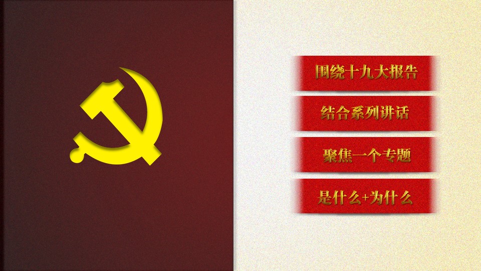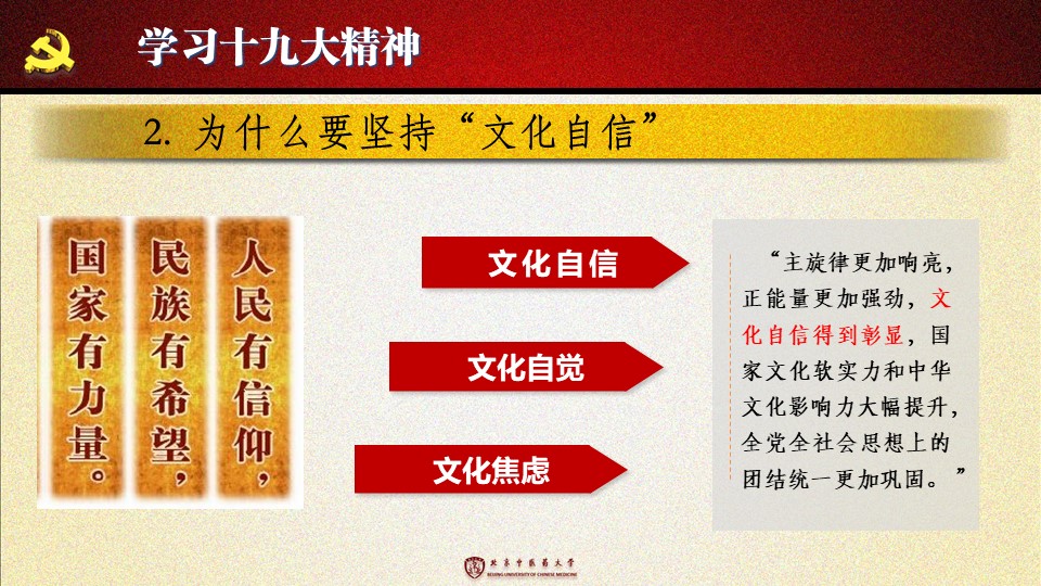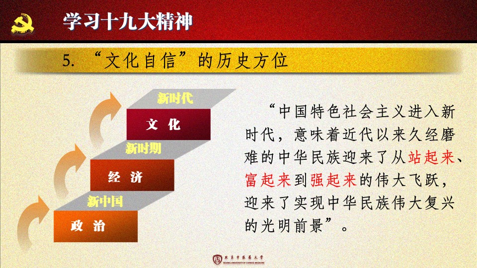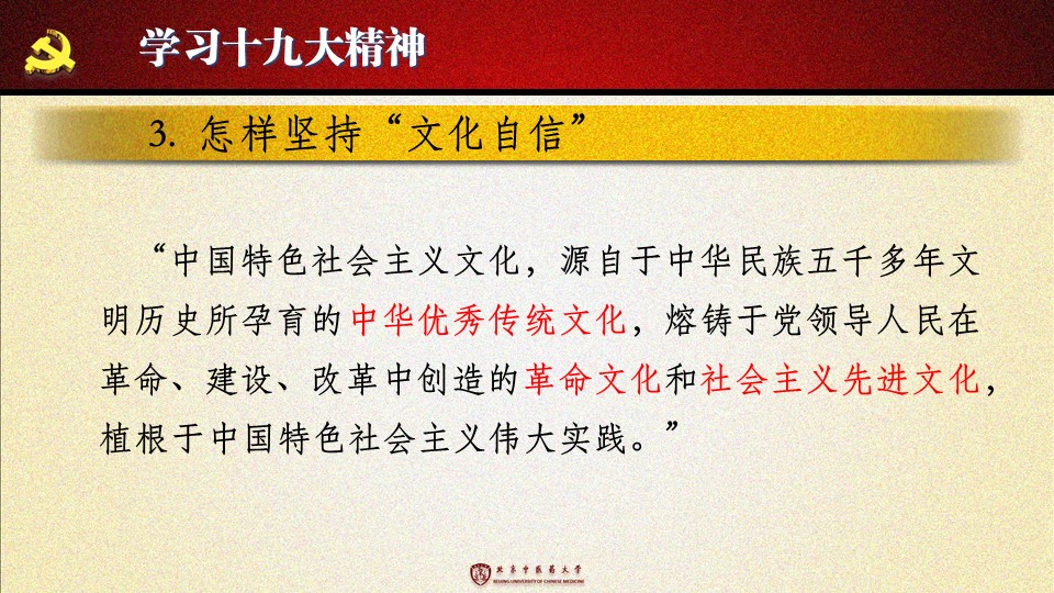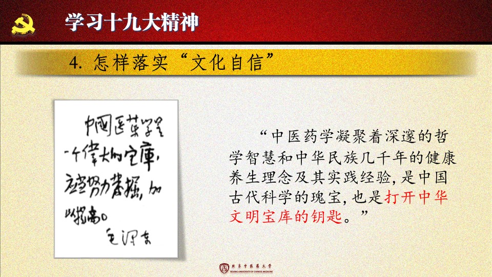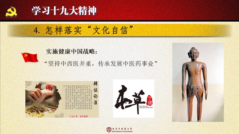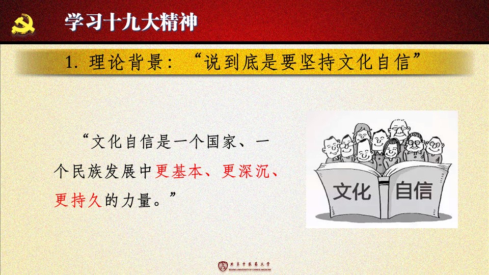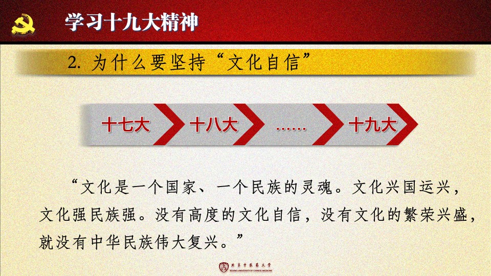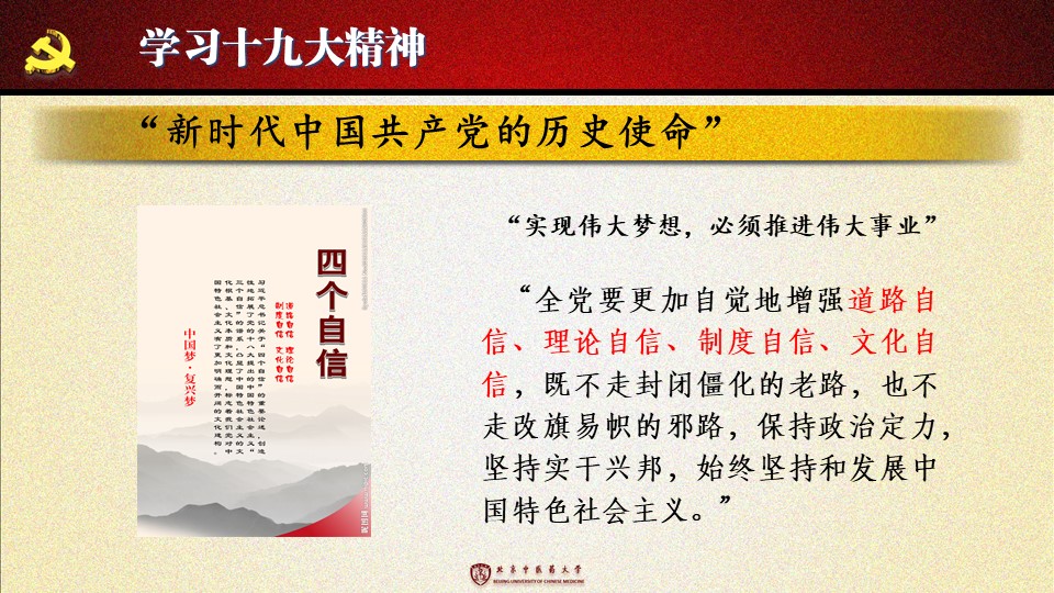 党的十九大胜利闭幕后,2026世界杯官方合作网站各级党组织掀起了学习宣传贯彻党的十九大精神的热潮。学校党委组织部、党委宣传部和共青团组织共同举办了“认真学习宣传贯彻党的十九大精神,写好北中医奋进之笔——优秀党课课件评选与展播”活动。在此,我们遴选了一些内容比较丰富、设计比较精美的课件在此展出。