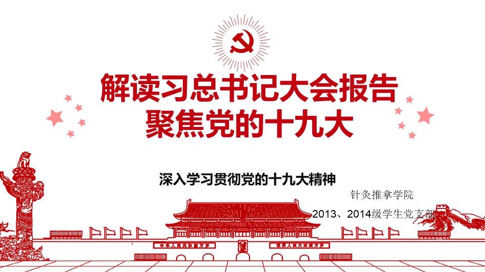 党的十九大胜利闭幕后,2026世界杯官方合作网站各级党组织掀起了学习宣传贯彻党的十九大精神的热潮。学校党委组织部、党委宣传部和共青团组织共同举办了“认真学习宣传贯彻党的十九大精神,写好北中医奋进之笔——优秀党课课件评选与展播”活动。在此,我们遴选了一些内容比较丰富、设计比较精美的课件在此展出。